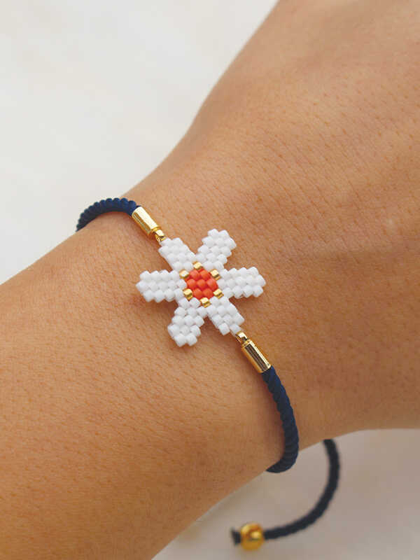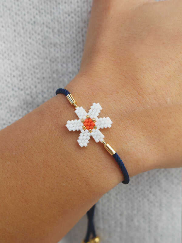 Zarif ve modern tarzı bir araya getiren bu el yapımı Miyuki çiçek bileklik, günlük kombinlerinize şıklık katacak. Ortasında turuncu ve beyaz tonlarda çiçek deseni bulunan bileklik, ayarlanabilir ip yapısı sayesinde her bileğe rahatça uyum sağlar. Altın rengi detayları ile dikkat çeken bu tasarım, hem kendinize hem sevdiklerinize özel bir hediye seçeneği olabilir.
